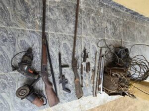 “A comprehensive search of the illicit factory yielded a significant cache of weapons, tools, and materials used in the manufacturing process. The recovered items include: Three (3) fabricated locally made guns; Five (5) pieces of metal pipes; Two (2) iron rods; Assorted copper wires; and Two (2) flat metals designed for fabricating gun butts.