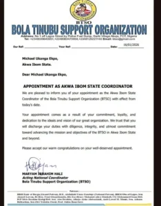 The Bola Tinubu Support Organization (BTSO) has appointed Mr. Michael Ekpo as its Akwa Ibom State Coordinator.